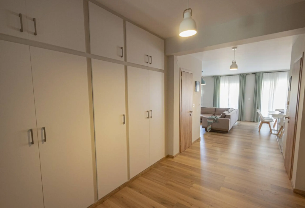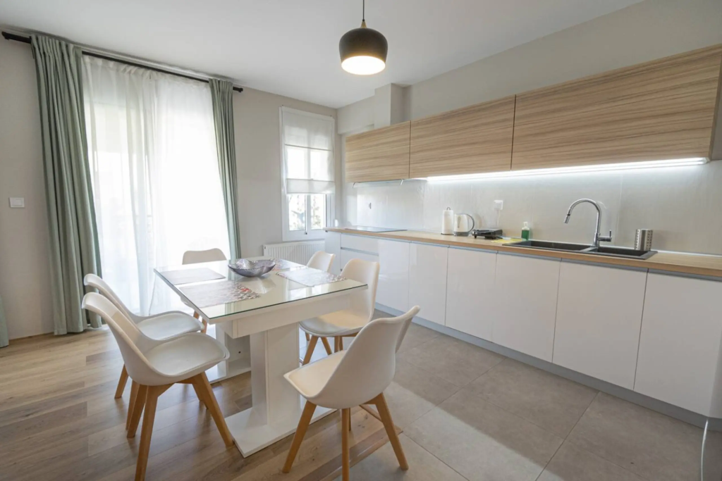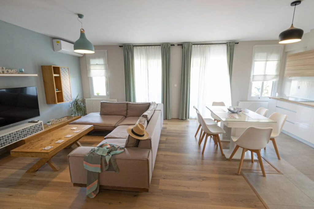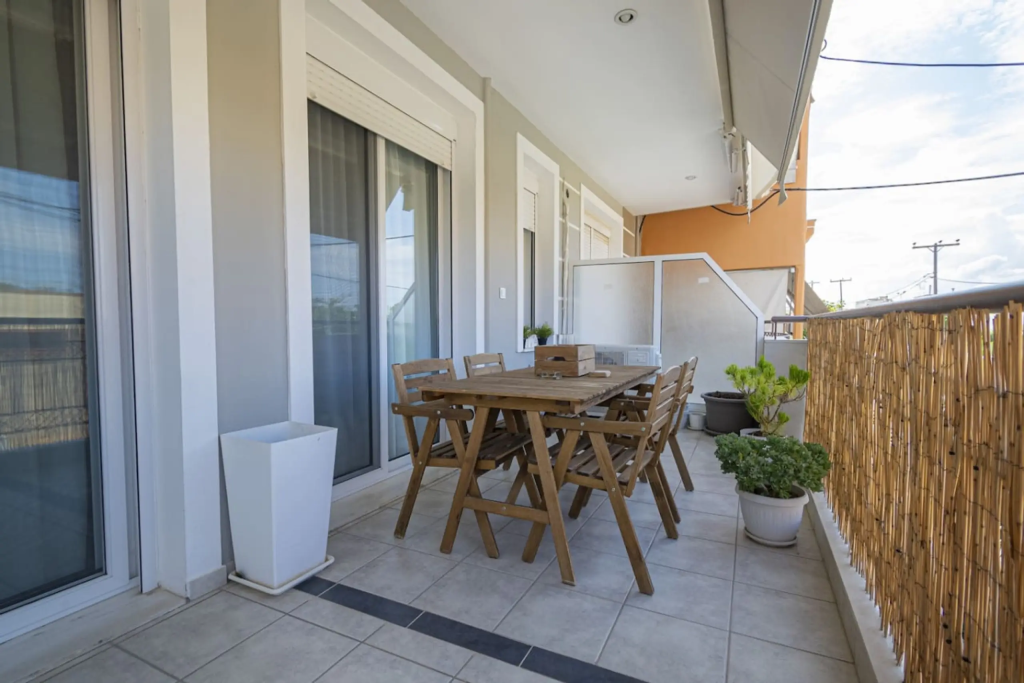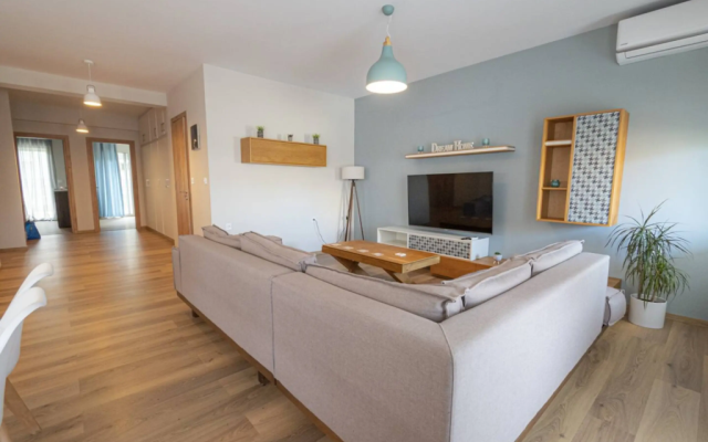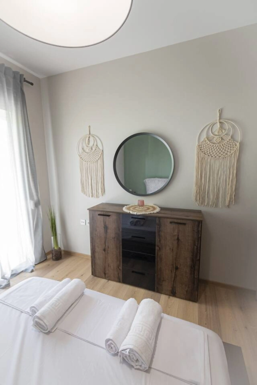 Stylish 2-bedroom apartment in the heart of Nea Moudania, just minutes from the beach. Features a fully equipped kitchen, spacious living room, 2 bathrooms (with washer), and a large balcony with outdoor dining. Perfect for families, couples, or remote workers looking for comfort, natural light, and a great location close to shops, cafes, and restaurants.